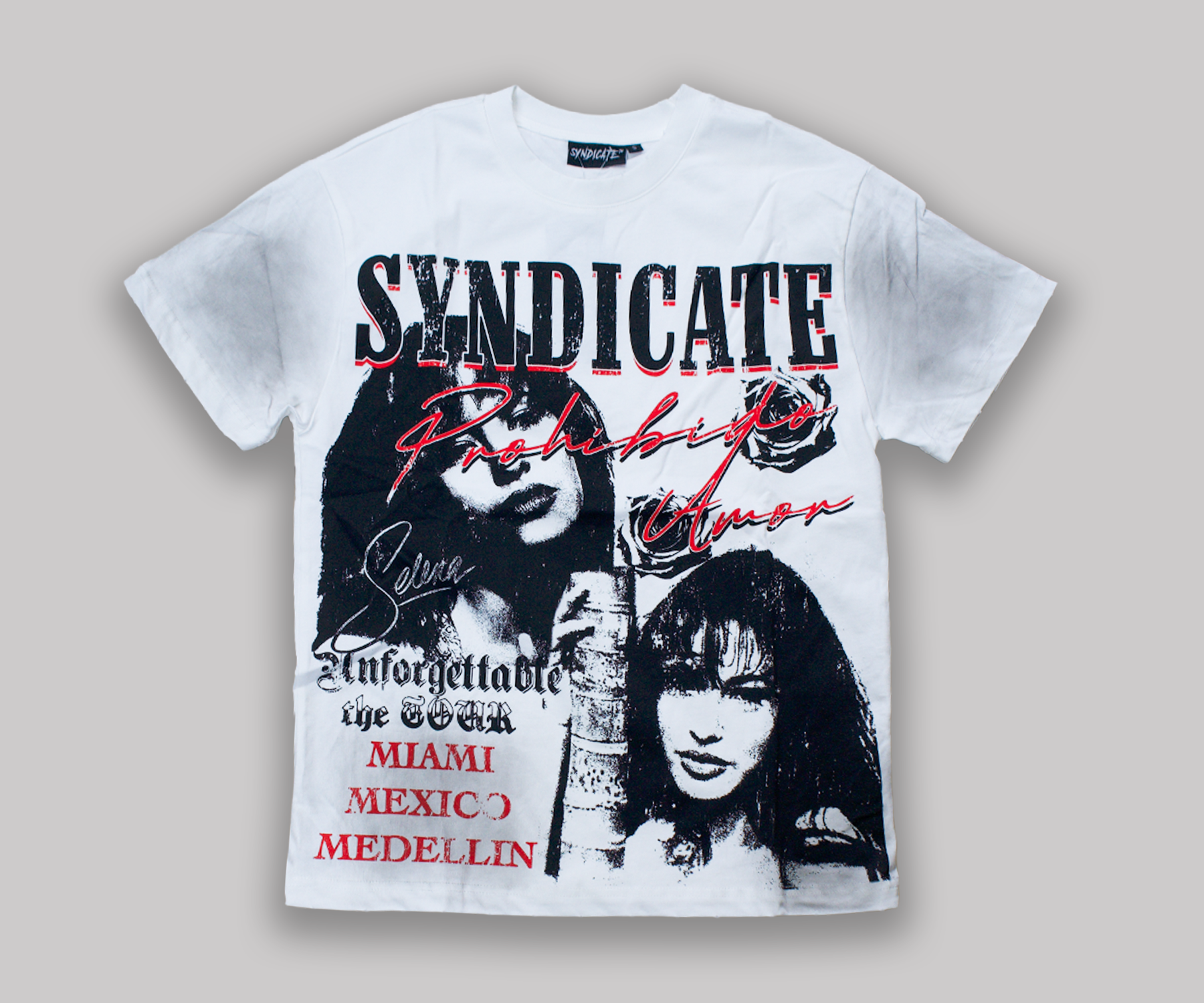 The Syndicate Prohibited Tour Tee features a bold multi-layer front graphic with vintage-inspired portraits, distressed lettering, and tour-style city callouts. Designed to feel like a statement piece straight out of a pop-era archive.